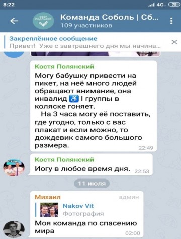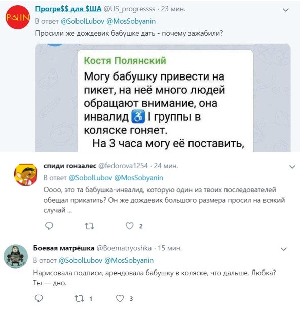 Ранее в Telegram-канал «Выпускайте Кракена!» был опубликован скриншот с перепиской команды Соболь. Один из активистов, по имени Константин Полянский, предложил «арендовать» свою бабушку-инвалида первой группы. Прям «припарковать» последи пикета с плакатом в руках. Он даже заботливо попросил, чтобы бабушке предоставили дождевик больших размеров.