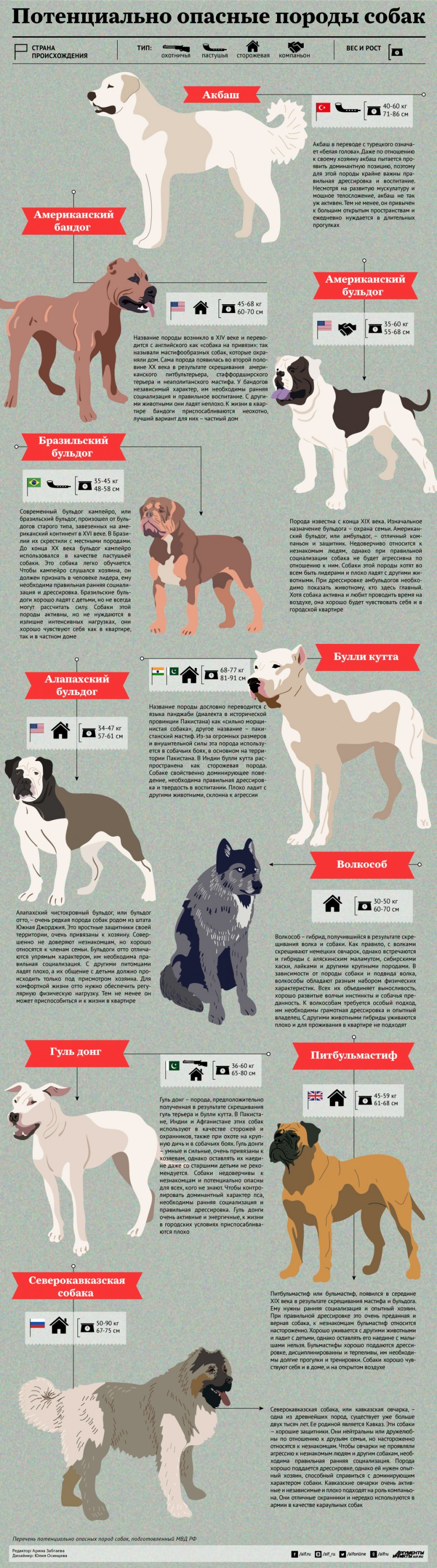 В новый список вошли 12 пород. К потенциально опасным отнесли следующих собак: акбаш, американский бандог и бандог (бэндог, многие специалисты объединяют эту породу с американским бандогом), амбульдог (американский бульдог), бразильский бульдог, булли кутта, бульдог отто, волкособ и вынесенные в отдельный пункт другие волко-собачьи гибриды, гуль донг, питбульмастиф и северокавказская овчарка. Еще одним — тринадцатым — пунктом выделены метисы этих пород.