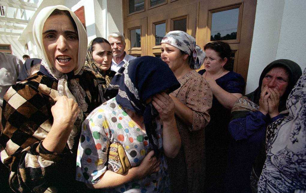 Беженцы из сел Рахата и Ансалта у здания Госсовета Дагестана в Махачкале, 9 августа 1999 года