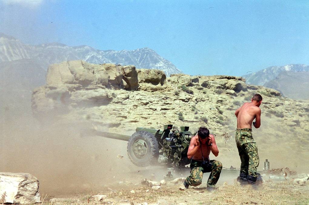 Бойцы расчета гаубицы Д-30 проводят обстрел выявленных в расположении экстремистов целей, 10 сентября 1999 года