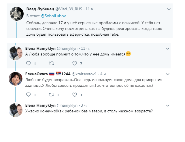 Но какое дело Любе до человечности. Подобное она проделывала уже не раз. В ее акциях участвовала бабушка-колясочница, которую на митинги привозил внук, соратник Соболь. В чате «Команда Соболь» он предложил привезти свою родственнцу, предположив, что такая история вызовет резонанс.