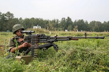Военнослужащий воздушно-десантных войск России стреляет из крупнокалиберного пулемета НСВ-12,7 «Утес» во время учений