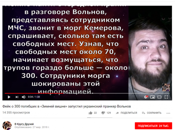 Популярный украинский блогер Евгений Вольнов устроил издевательскую трансляцию под названием «Угораем с Кемерово» на YouTube после трагедии в ТЦ «Зимняя вишня». Во время стрима пранкер распространил фейковый слух о том, что в торговом центре погибли около 300 человек.