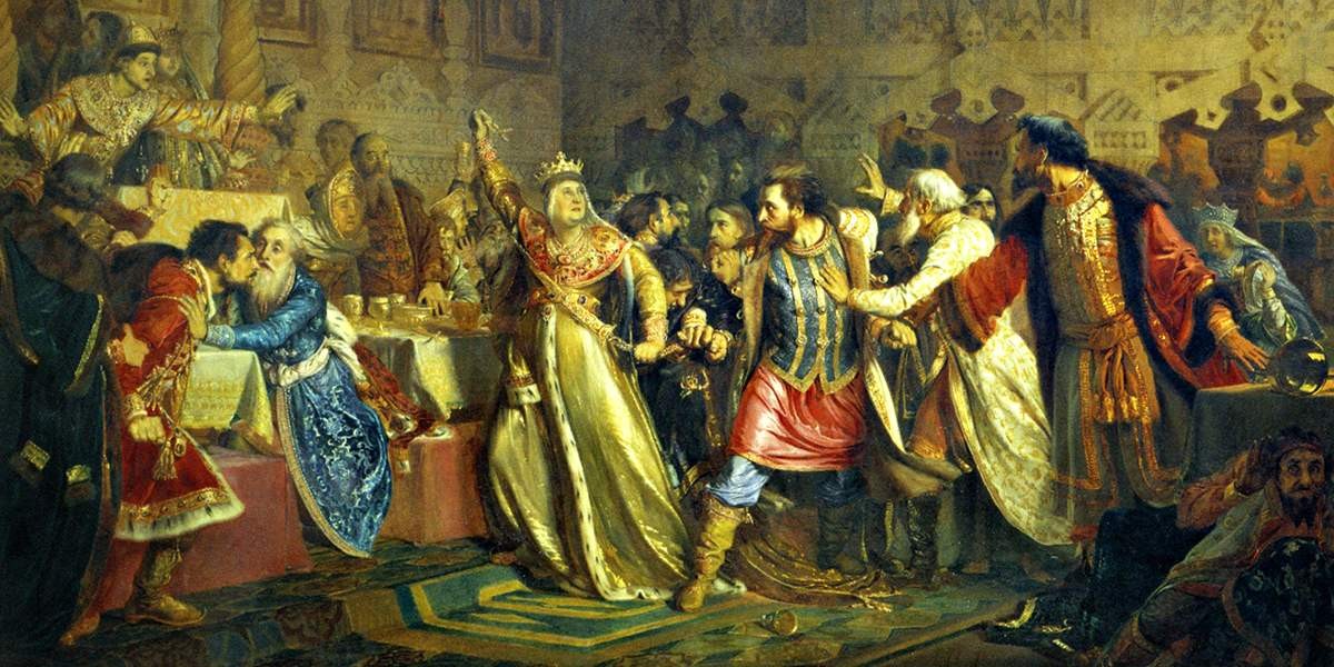 «Великая княгиня Софья Витовтовна на свадьбе великого князя Василия Тёмного в 1433 году срывает с князя Василия Косого пояс», художник — П. Чистяков