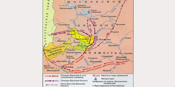 Бегство разбитого князя смахивало на победный марш. Перед ним открыли ворота Вологда, Заозерье и Устюг. Весной, собрав сторонников, Василий Косой с новым войском подступил к Костроме, занял город и обосновался там. Война приняла затяжной характер, а боевые действия шли на периферии русского государства. На поход к столице у Василия Косого было слишком мало сил.