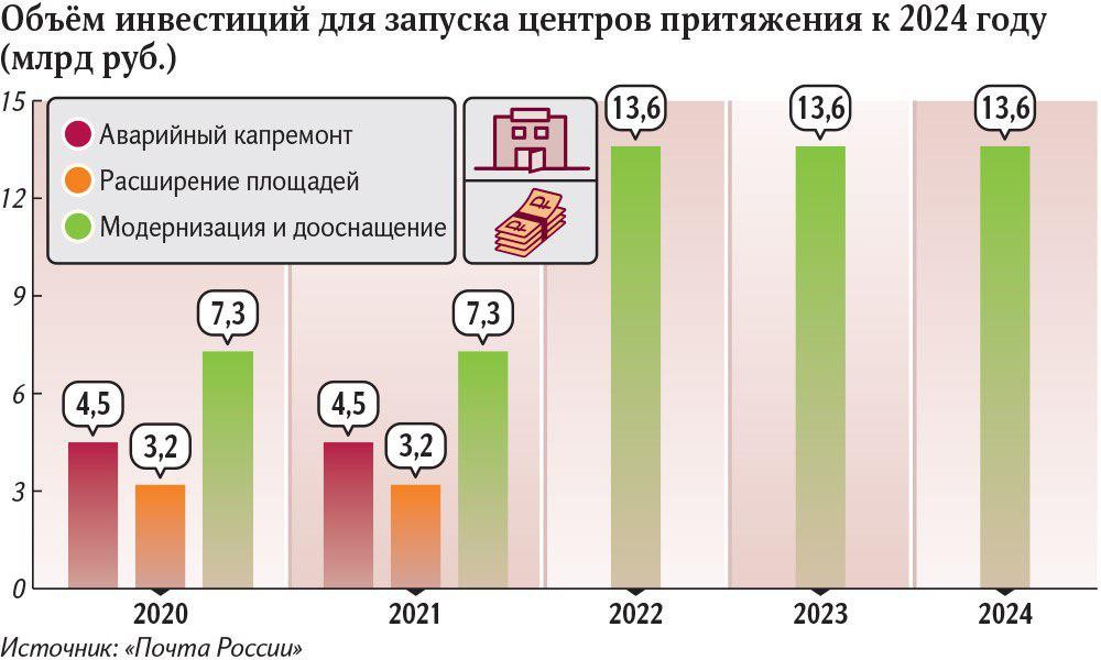 Для реализации задуманного «Почта России» просит из бюджета почти 85 млрд рублей. Из них 66,4 млрд — на техническую модернизацию и дооснащение отделений почтовой службы, 10,8 млрд — на проведение капитального ремонта, а еще 7,7 млрд рублей — для расширения площадей отделений.