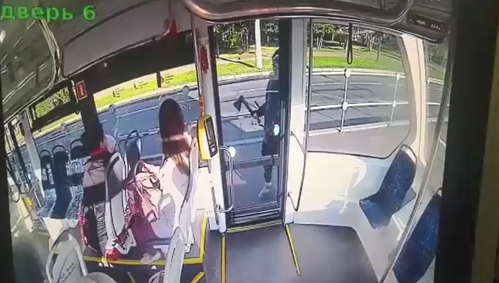 Мужчина, находившийся на остановке, не сумел попасть в подъехавший трамвай. После секундного замешательства несостоявшийся пассажир внезапно выхватил топор и вынес стеклянную дверь, преградившую ему путь в общественный транспорт.