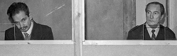 Бывшие капитаны Вадим Марков (справа) и Виктор Ткаченко, обвиняемые в столкновении пассажирского лайнера «Адмирал Нахимов» и сухогруза «Петр Васев», во время заседания судебной коллегии по уголовным делам Верховного суда СССР. 12 марта 1987 года