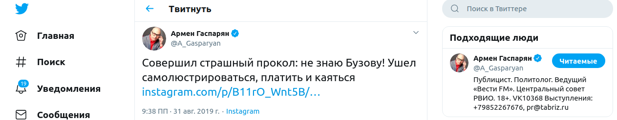 "Совершил страшный прокол: не знаю Бузову!" - написал Гаспарян.
