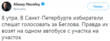 Так, с самого открытия участков для голосования Навальный и его подельники стали вбрасывать фейки о том, что в Петербурге в автобусах подвозят на голосование людей. И это якобы одни и те же люди на разных участках.