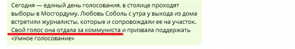 Даже Люба Соболь, которая топила за независимых кандидатов, проголосовала за коммуниста. Правда, ее спалили с этим на «Дожде», чем, кстати, подтвердили наличие договора между Навой и КПРФ. Потом, правда, информацию о голосовании Соболь удалили – видно, поняли, что подставили либеральных коллег.