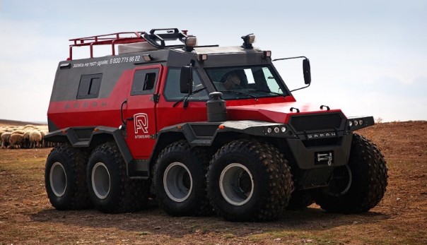 Восмиколёсный вездеход «Шаман» — это оригинальная разработка российской компании. Среди особенностей конструкции транспортного средства можно отметить «продвинутую» полноприводную трансмиссию 8×8 (привод на две передние оси подключается при необходимости) и блокировками всех дифференциалов и систему рулевого управления, позволяющую поворачивать колёсам всех осей.