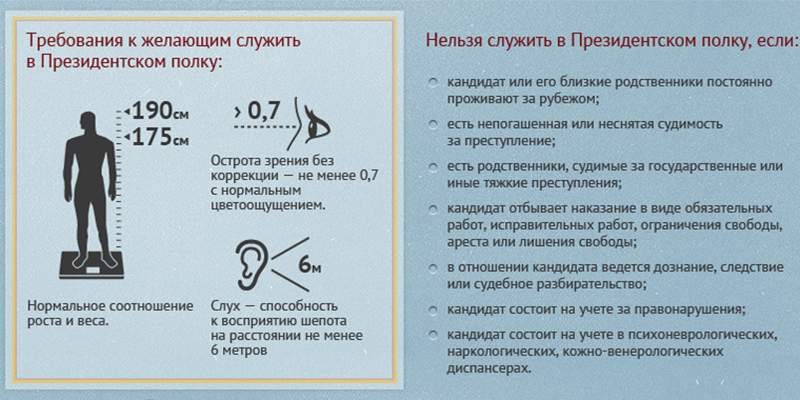 Кого берут в Президентский полк — вот тут самое раздолье для мифов и слухов. Да, пухленьких коротышек в очках не берут. Рост — важный показатель, и вес должен ему соответствовать. Но для вас сделают исключение, если у вас есть личные заслуги.