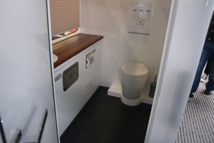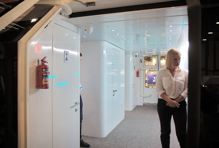 Но меня впечатлило не только это. Удивительно насколько продуманным получился этот кораблик. Ну например, салон. Кресла для салона компания также разработала и производит сама. И они разработаны так, что одно и то же судно, буквально за час можно легко трансформировать из речного трамвайчика в ресторан на воде. Все кресла легко двигаются по салону, и не закреплены жестко. Между ними расположены специальные подлокотники, и в зависимости от пожеланий и назначения судна в данный конкретный момент, подлокотники можно убрать, добившись максимальной вместимости в 86 пассажиров, тем самым превратив судно в речной автобус.