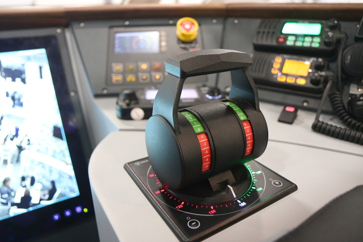 Или, например, рубка капитана судна. Она очень компактна, но очень удобна. Чтобы сесть в кресло, не нужно его обходить — оно установлено в поворачивающемся модуле, и вращается на 360%. И сидишь как будто не в рубке судна, а в рубке небольшого космического корабля. Видео на главный обзорный экран передается с нескольких камер, уставленных по периметру корпуса. Вокруг приборы, кнопки, в руках два джойстика управления двигателями напоминающие РУДы самолета, но управляют они не только тягой, но и курсом. Поэтому никакого штурвала нет, каждый из двух двигателей управляется независимо, за счет чего обычно неповоротливый катамаран может развернуться почти на месте.