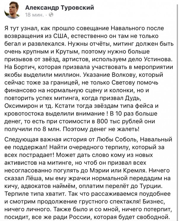 «Я тут узнал, как прошло совещание Навального после возвращения из США, естественно, он там не только бегал и развлекался. Нужны отчеты, митинг должен быть очень крупным и крутым», — написал на своей странице в Facebook Туровский. По его словам, все усилия, в том числе финансовые, направлены на привлечение к митингу звезд. Туровский полагает, что киноактрисе Александре Бортич предложили миллион рублей.