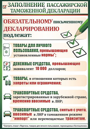 "В целях разъяснения законодательства в сфере таможенного дела Государственный таможенный комитет ЛНР разработал плакаты-памятки для граждан, пересекающих границу нашей Республики. В плакатах максимально наглядно изложены нормы законодательства для того, чтобы любой гражданин смог ознакомиться и, что немаловажно, понять суть", - сказал Афанасьевский.
