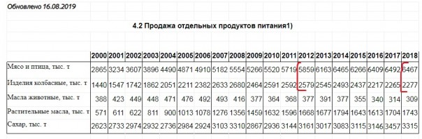 3) А вот таблица реализованных российскому населению через розничную торговлю мяса и колбасы: