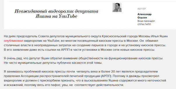 Кстати, фейк с киосками опровергли и на оппозиционном радио «Эхо Москвы». Александр Оськин выступил у них в роли эксперта и рассказал, что Яшин несет, по-русски говоря, пургу.