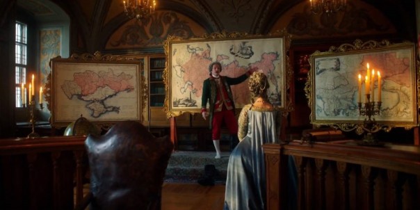 Вот, например, он читает Екатерине II лекцию о геополитике, стоя перед картой империи. «Взглянем на юг, — говорит Григорий. — Там находится Крым».