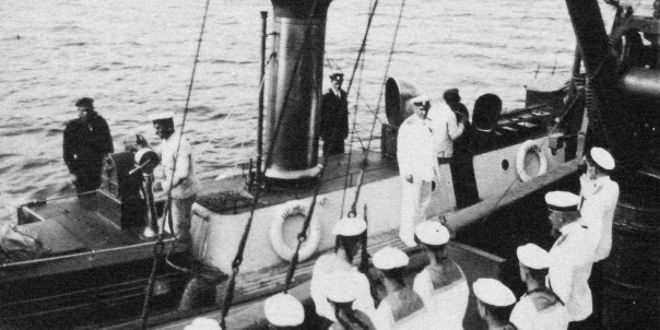Контр-адмирал Старк напутствует экипаж канонерской лодки «Магнит» в плавание на Камчатку и дальше. Рапорт командира. Рядом — рейдовый разъездной катер «Орлик»