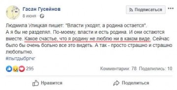 Первый вице-президент Центра политических технологий, профессор ВШЭ Алексей Макаркин: "Пост Гасана Гусейнова уже вызвал предсказуемую кампанию привычно оскорблённых с требованиями посадить, уволить, депортировать".