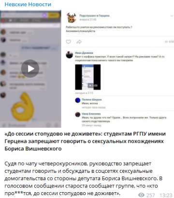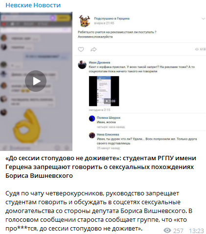 По факту сообщений от бывших жертв сексуально озабоченного депутата петербургского Заксобрания Бориса Вишневского ведется расследование, как заявлено в сообществе РГПУ им. Герцена в «ВКонтакте». Руководство вызывает самых активных студентов и… запрещает им давать комментарии о характере отношений с оскандалившимся преподавателем.