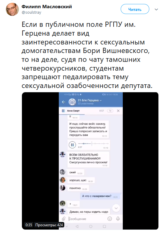 Понятно, что в ректорате РГПУ у педофила Бориса Вишневского есть могущественные заступники, раз руководство не спешит осуждать поведение своего преподавателя, а старательно покрывает его и затягивает время, прикрываясь псевдорасследованием. А, возможно, указание обелять любителя молоденьких тел поступило и вовсе напрямую из ЗакСа, где у Вишневского есть связи на самом высоком уровне.