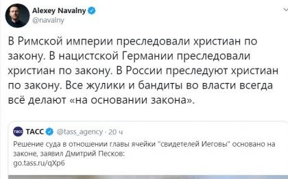 Почему же они не коррелируют даже между собой, эти примеры? Просто потому, что в Римской империи христиан преследовали за непочитание божественной природы императора, а ни в России, ни даже в Третьем Рейхе никому и в голову бы не пришло сажать за такое в места лишения свободы. В гитлеровской Германии отдельных христиан (католиков и т.д.) притесняли за слишком уже интернациональный характер их церквей, чего им не вменяли в вину ни в Риме, ни в современной России (где никто слова дурного не говорит ни католикам, ни каким-нибудь баптистам). Наконец, просто потому, что «Свидетели Иеговы» — это такие «христиане», которые… не христиане. Короче, Навальный намешал всё в кучу, даже не подумав хоть малость над своей шизофазией.