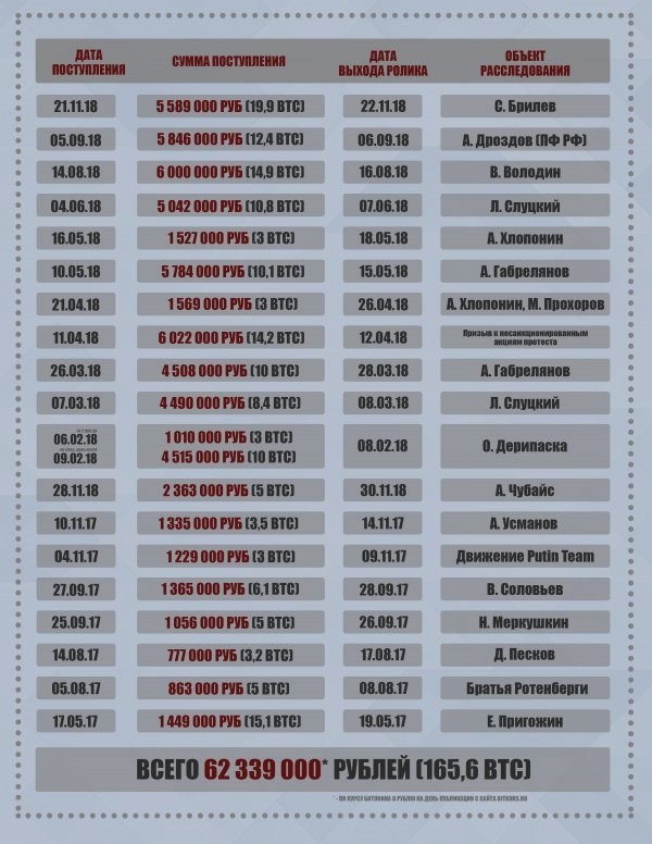 Еще 17 ноября, перед тем, как в Сети был опубликован ролик о генеральном директоре «Роскосмоса» Дмитрии Рогозине, электронный-кошелек либераста Навального пополнился на 2 биткоина. В рублях это около 900 тысяч. А после, 18 ноября, денег на счету уже не было.