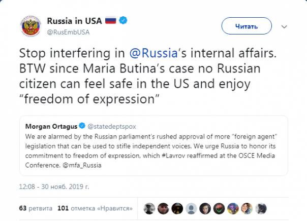 В посольстве отметили, что после уголовного преследования американскими властями Марии Бутиной "никто из российских граждан не может чувствовать себя безопасно в США", а также пользоваться правом на свободу слова.