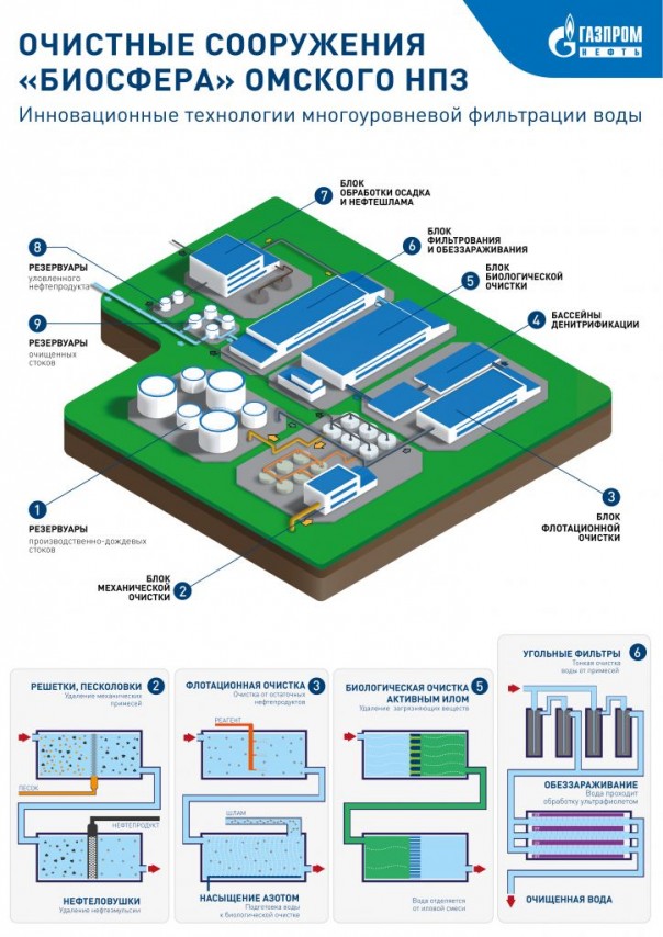 Резервуарный блок «Биосферы» состоит из 12 резервуаров объемом от 100 до 20 тысяч кубических метров, изготовленных отечественными производителями в соответствии с международными стандартами. После смешивания в резервуарном блоке, вода направляется на механическую очистку, где удаляют примеси и нефтепродукты. Далее на физико-химическом этапе вода очищается реагентами и отправляется в специальный биореактор, где остатки нефтепродуктов поглощают микроорганизмы. На последней ступени вода пропускается сквозь угольные фильтры, обеззараживается ультрафиолетом и возвращается в производство. Отфильтрованные нефтепродукты при этом отправляются в переработку.