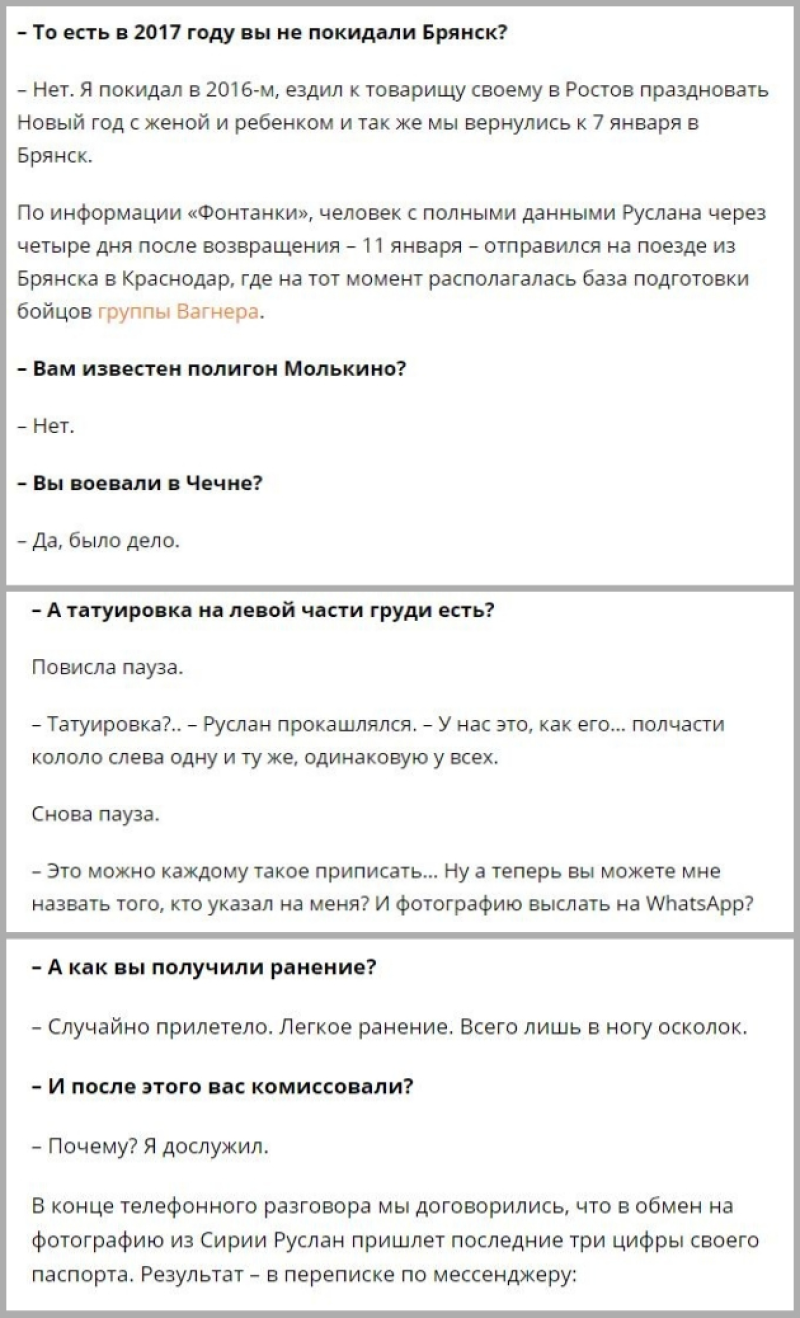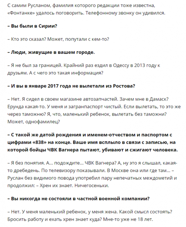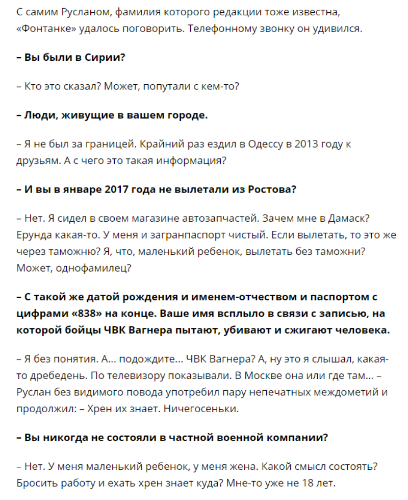 Итак, что же пишет «Фонтанка»? Журналист, не мудрствуя лукаво, сразу же переходит к сути и начинает бомбардировку собеседника острыми вопросами по существу, пытаясь выяснить личные данные, сроки и место прохождения военной службы, подробности поездки в Сирию. Кстати, «изданию известна фамилия Руслана», но почему-то она не называется.