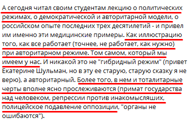 Депутат ЗакСа Санкт-Петербурга Борис Вишневский в своем ТГ-канале написал увлекательный пост об авторитарной России. При этом он упомянул о «московском деле», называя «возмутительно неправосудными» решения по данной теме. Подытожил свой пост Вишневский тем, что в России не тот режим, но «переделывать систему» пока «сил не хватает».