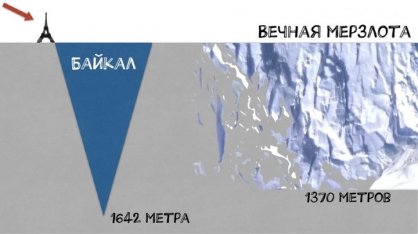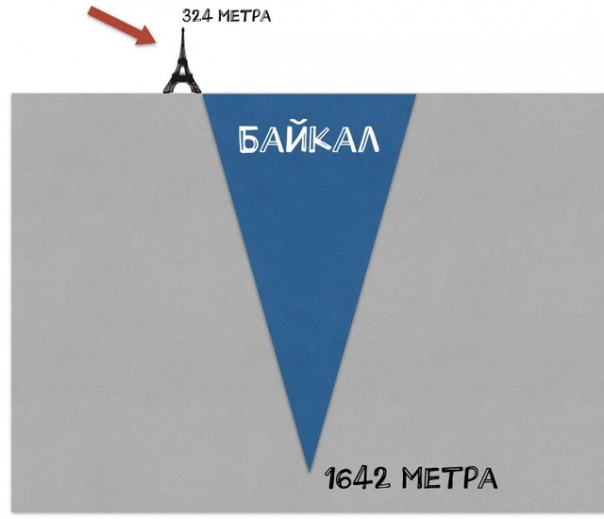 Взгляните. Это – озеро Байкал. Его максимальная глубина – 1642 метра. Для масштаба я поставил на его берег Эйфелеву башню.