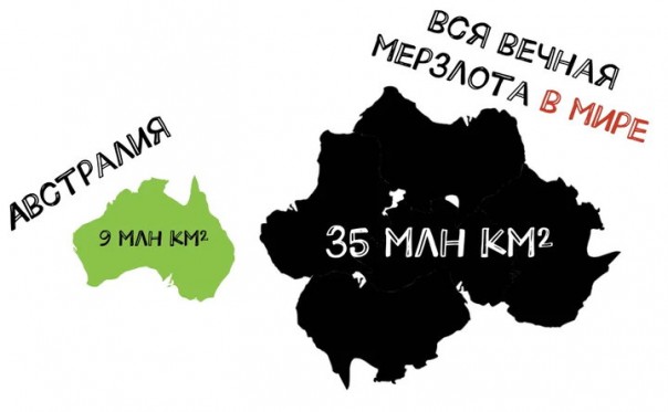 Вся вечная мерзлота мира занимает в 4 раза большую площадь, чем Австралия. Кстати, мы не зря взяли именно Австралию, ведь это единственный материк, на котором вечной мерзлоты нет совершенно. А на остальных материках она есть. Даже в Африке.