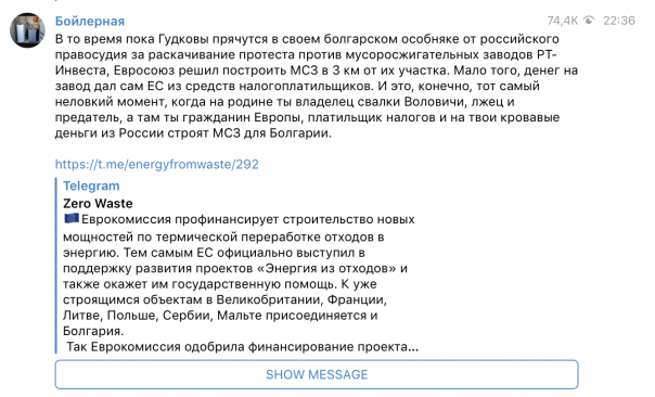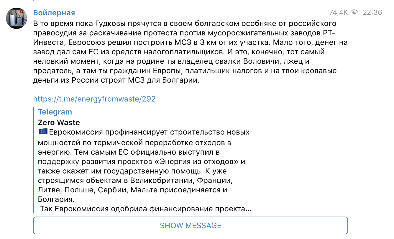 Знаете, наверное это карма. Даже небу обрыдло вранье этой семейки мошенников и очковтирателей - и вот теперь у нас два завода W2E персонально для Гудковых. Один в Коломне, другой в Болгарии. И хотя заранее понятно, что завод в России плохой-плохой, ведь из-за него закрыли свалку Гудковых "Воловичи", которая приносила сотни миллионов. Но зато сейчас в ответ на их визг против мусорной реформы можно спокойно задавать вопрос "А что с заводом в Болгарии?" )))