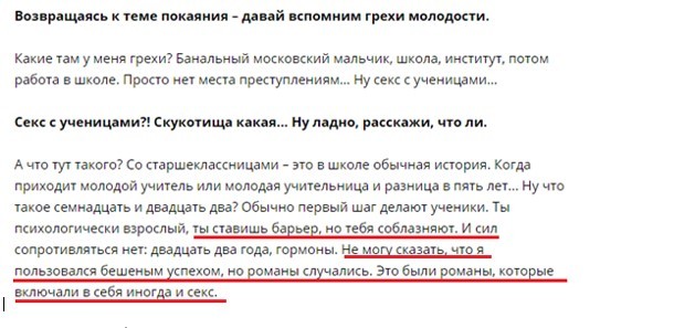 До должности главреда он был учителем в школе. В своих интервью он неоднократно с гордостью заявлял, что спал со старшеклассницами. Привычка заводить интимные отношения с теми, кто младше, осталась у него до старости.