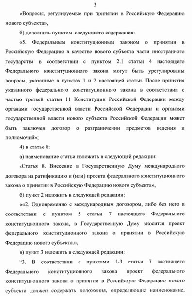 В документе, также говорится, что в случае принятия в РФ нового субъекта части иностранного государства этому субъекту предоставляется статус республики, края, области, автономной области или автономного округа.