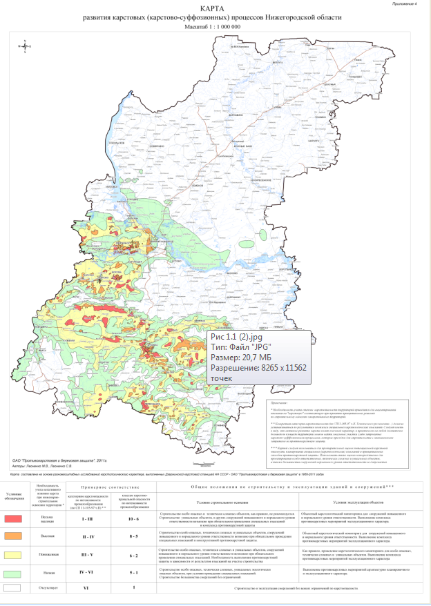 Карстующиеся породы на территории Нижегородской области залегают, как правило, на глубинах от 5 м до 70-80 м. Вследствие этого карст на земной поверхности и в основании сооружений проявляется преимущественно в центральной, юго-западной и западной частях Нижегородской области, что указано на карте развития карстовых (карстово-суффозионных) процессов (рисунок 1.1 ниже).