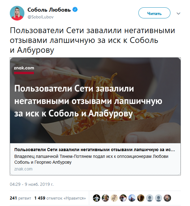 Именно так Наве удалось нанести серьезный материальный ущерб (свыше 100 млн рублей) ресторану «Армения» и лапшичной «Тянем-потянем». Обе харчевни подали иски (к Навальному и его подручной Соболь) за убытки в ходе акций протеста, но «фюрер» и его нава-югенд предпочли не компенсировать потери бизнеса, а увеличить, натравив армию платных ботов на заведения.