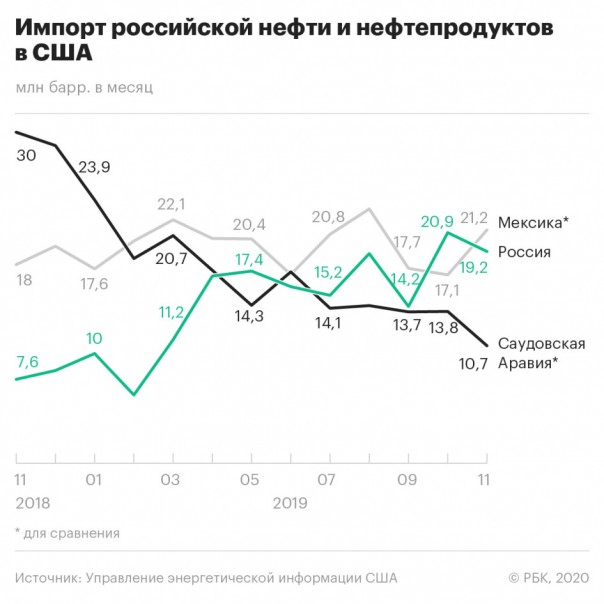 Россия увеличила поставки в США, в основном за счет нефтепродуктов: в октябре 2019 года они выросли в 2,5 раза (по сравнению с началом года), до 16 млн барр. Россия традиционно была вторым крупнейшим после Канады поставщиком нефтепродуктов в США (но не нефти), а осенью она резко нарастила объемы. В ноябре российские компании экспортировали в США уже 17 млн барр. нефтепродуктов, поставив исторический рекорд. Импорт из Канады составил 18 млн барр. топлива.