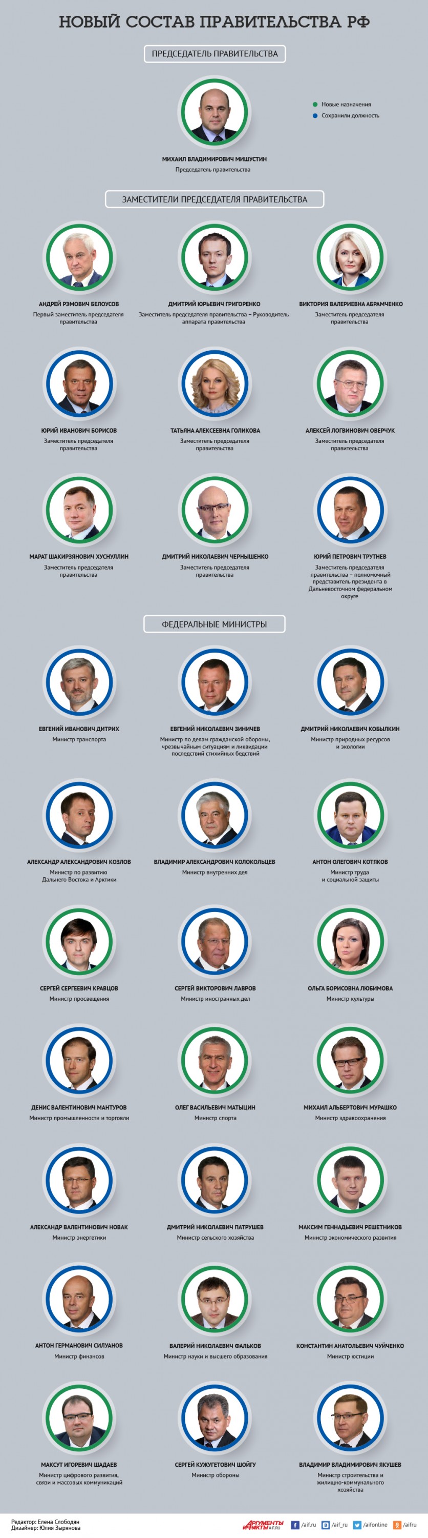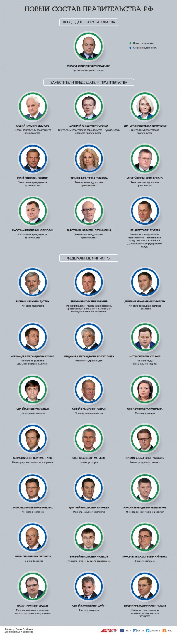 Уровень образования у членов нового кабмина достаточно высок. Подсчитано, что в правительстве 12 экономистов, 6 инженеров, в т. ч. 3 горных, 4 юриста, 2 учителя и 1 врач. Многие министры получали допобразование, учились в магистратуре и защищали диссертации в Высшей школе госуправления РАНХиГС — например, М. Мишустин защитил там докторскую. Немало новых министров имеют юридическое образование.