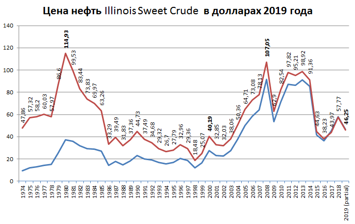 К тому же и цена на нефть с учетом инфляции доллара ниже была только в "святые 90-е", а в СССР она была сопоставима с ценой на нефть в самые "тучные годы" Путинской эпохи.