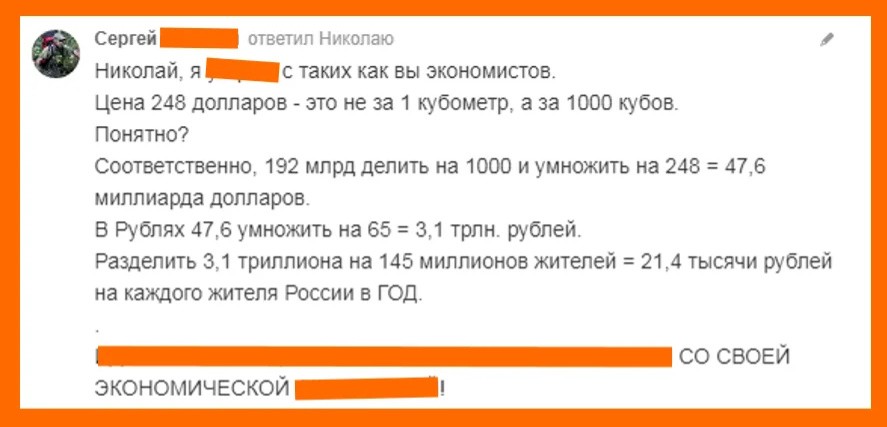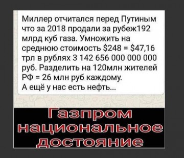 Вероятно из-за такого газового богатства, перевозбудившаяся оппозиция преподносит нам подобные расчеты доходов на каждого гражданина России от экспорта газа: