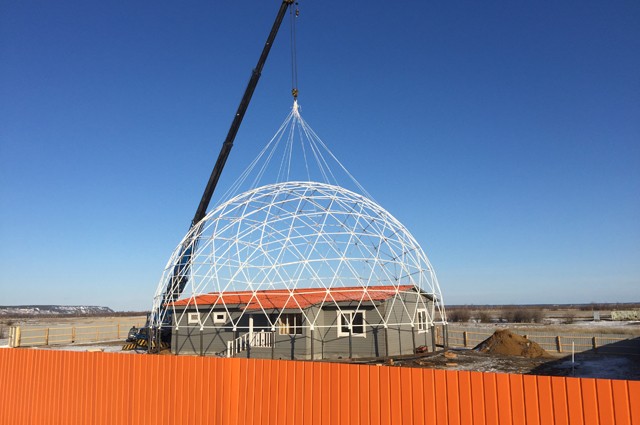 — На этапе монтажа самым сложным был вывод дымохода, — рассказывает Дмитрий Филиппов. — Для этого в куполе, который изготовила московская компания FullerDome, предусмотрено отверстие. Подрядчики «ВиконтСтройПродукт» —