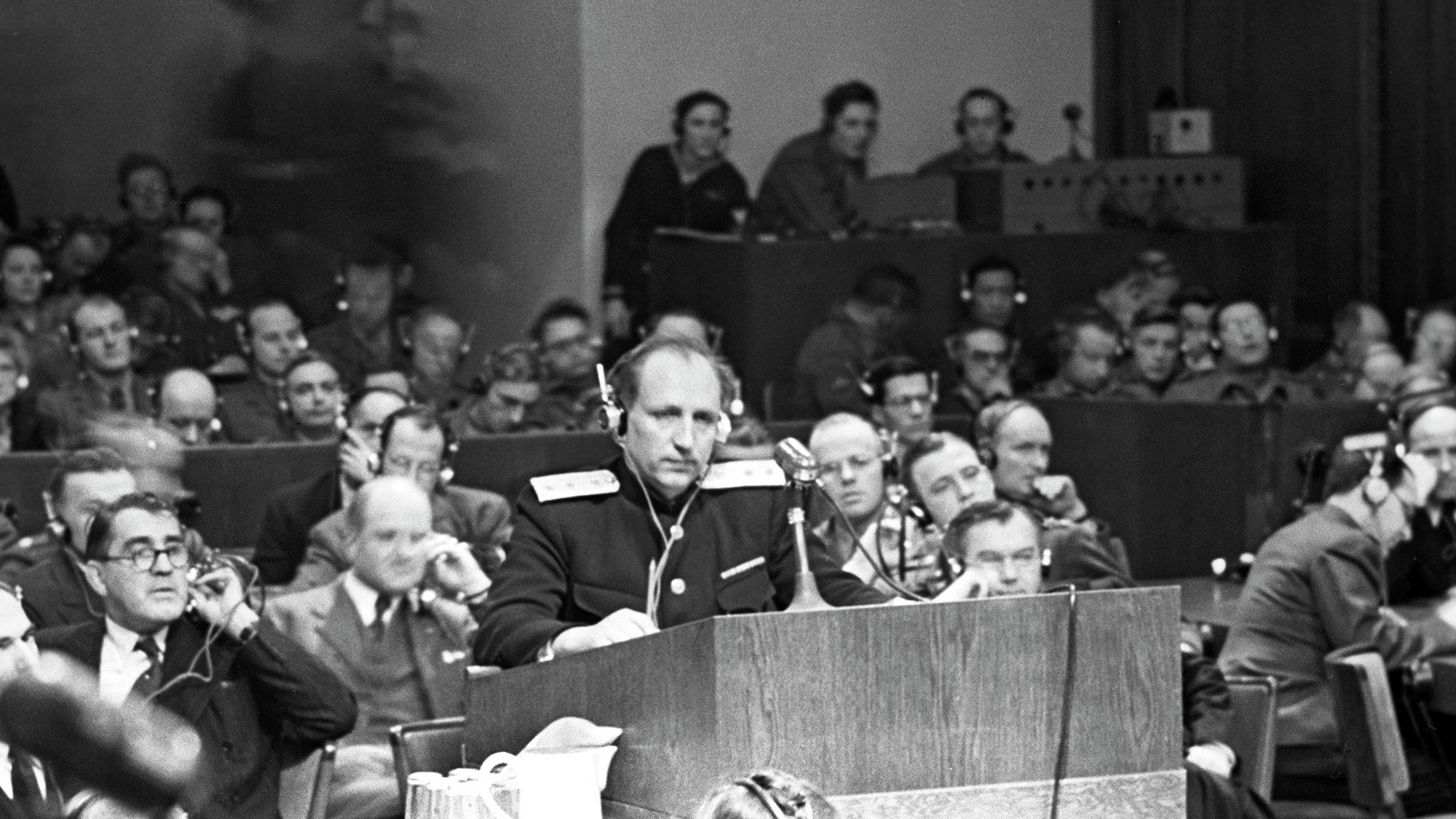 Главный обвинитель от СССР генерал-лейтенант Роман Андреевич Руденко во время выступления на Нюрнбергском процессе