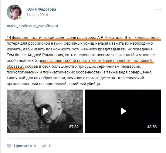 Девица внимательно следит за жизнеописанием всяческих маньяков, серийных убийц, занимается сатанизмом. День расстрела жестокого маньяка-убийцы Сергея Чикатило является для Федотовой днем траура.