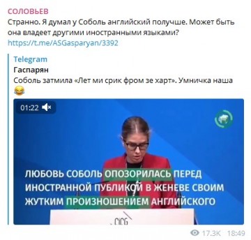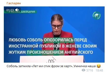 Да, все сейчас только что и делают, как обсуждают лингвистический провал соратницы Алексея Навального Любови Соболь. Она однозначно затмила Мутко с его скромным «лет ми спик фром май харт», и об этом успели сказать уже все Telegram-каналы.