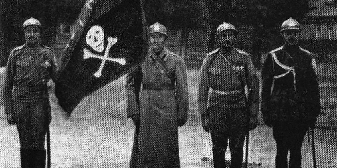 Знамёнщик, ассистенты и адъютант Ударного отряда 8-й Армии (позднее преобразован в Корниловский ударный полк) поручик князь Ухтомский, 1917 г. На касках — череп со скрещёнными костями; на рукавах — синяя полковая эмблема